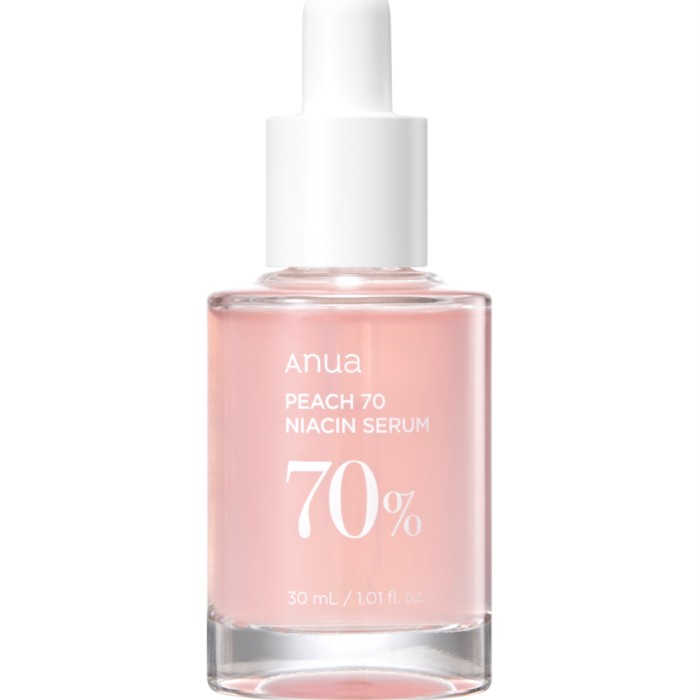 Anua Peach 70% Niacinamide Serum är ett uppljusande serum med niacinamid och persikoberikade ingredienser, utformat för att lysa upp glåmig hud och ge huden lyster. Peach Yogurt Complex reducerar synligt ojämnheter. Niacinamid (5 %) förhindrar att melanin ansamlas och förflyttar sig till hudens yta.
