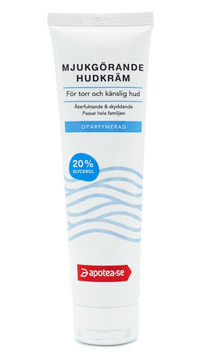 Apoteas mjukgörande hudkräm med 20% glycerol är en återfuktande och skyddande kräm som passar även små barns känsliga hud. En mild och effektiv, oparfymerad kräm som gör huden mjuk och kan användas av hela familjen, från barn till senior.
