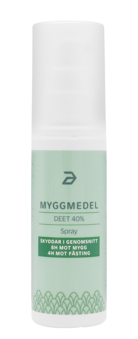 Apotea Myggmedel DEET 40% spray ger ett effektivt skydd mot myggor och fästingar. Myggmedlet skyddar användaren i genomsnitt 8 timmar mot stick från vanlig mygga, malariamygga och tigermygga (gula febern) och 4 timmar mot fästingbett. Skyddet mot vissa aggressiva tropiska fästingarter kan vara kortare.