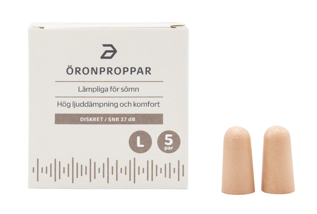 Förpackningen innehåller 5 par beige öronproppar, storlek Large. SNR 37 dB. (Finns även i storlek Small för mindre örongångar.)