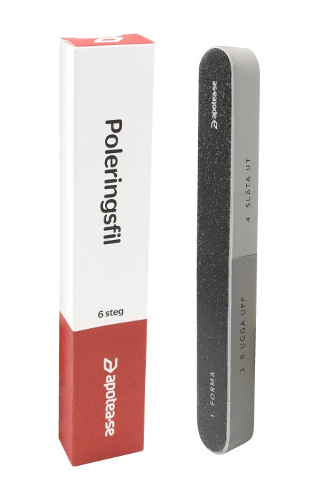 Apoteas Poleringsfil används för att forma och jämna till naglarna i sex steg. Sidorna är numrerade i den ordning de bör användas, och det står även på filen vilken funktion varje steg har.
