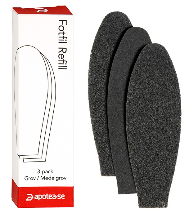 Förpackningen innehåller 3 st refillblad: 1 st med grov slipyta och 2 st med medelgrova slipyta.
