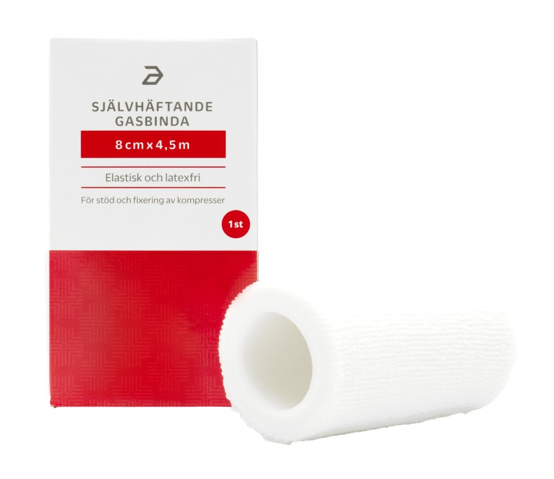 Förpackningen innehåller 1 st självhäftande gasbinda i storlek 8 cm x 4,5 m
