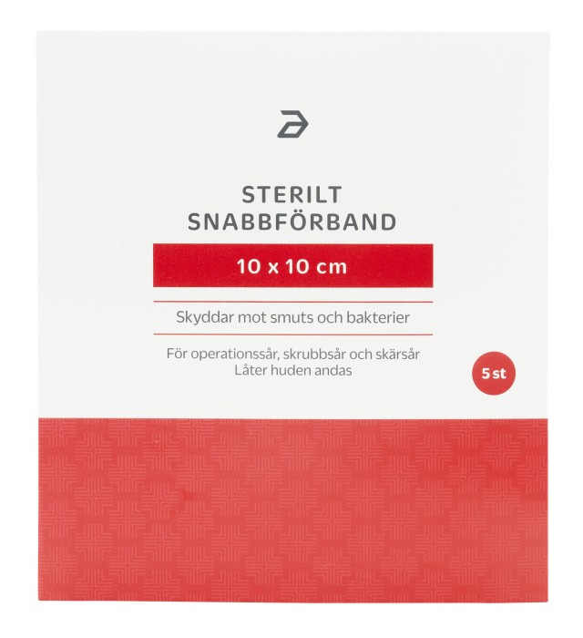 Förpackningen innehåller 5 st sterila snabbförband i storlek 10x10 cm.
