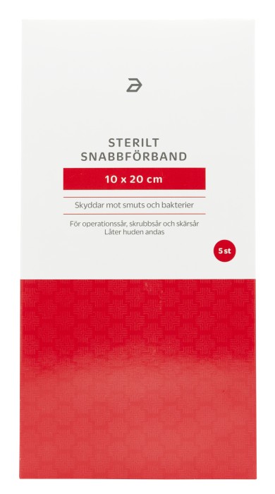 Förpackningen innehåller 5 st sterila snabbförband i storlek 10x20 cm.
