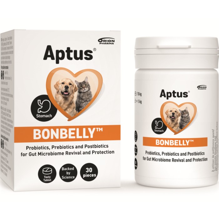 Aptus Bonbelly för hund och katt har en 6-i-1-formulering med pro-, pre- och postbiotika. Rekommenderas för en sund tarmflora till exempel vid diarré, användning av antibiotika och foderbyte. Den välsmakande tabletten kan ges som en godbit eller blandas med mat.