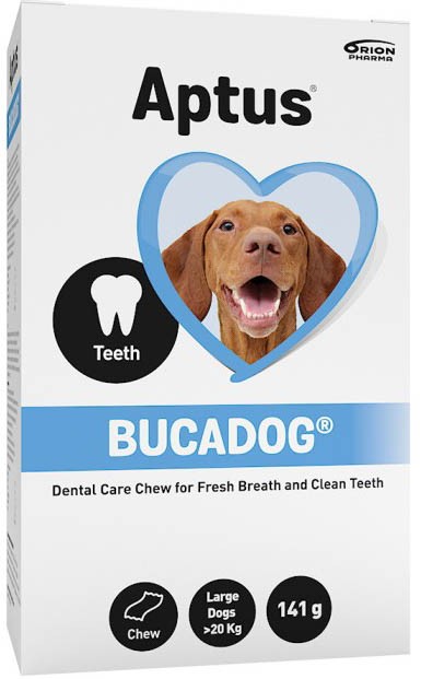 Bucadog tuggbitar innehåller enzymer som stärker munnens eget rengöringssystem, hämmar bakterietillväxten i munnen och därmed plackbildningen. Detta reducerar risken för att tandsten bildas och tänder och tandkött hålls friskt. Genom att hämma bakterietillväxten i munnen får hunden även en bättre andedräkt. Bucadog motverkar dålig andedräkt, minskar tillväxten av plack och motverkar uppkomsten av tandsten. Kan även förebygga tandköttsinflammation och tandlossning. Bästa effekt uppnås om tandytorna är fria från beläggningar innan första behandlingstillfället. Kontakta veterinär om tänderna behöver rengöras från tandsten.