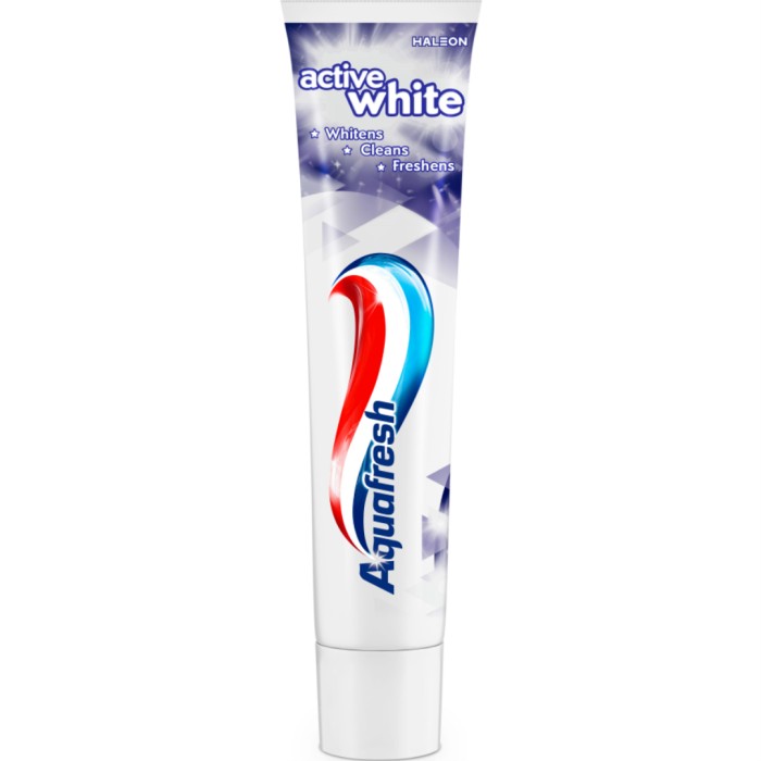Aquafresh Active White tandkräm är en flourtandkräm med en skonsamt polerande effekt som hjälper till att bibehålla tändernas naturliga vithet. Tandkrämens 3-i-1-skydd bidrar till ett friskt tandkött, starka tänder och en fräsch andedräkt. Tandkrämen har en mild mintsmak.
