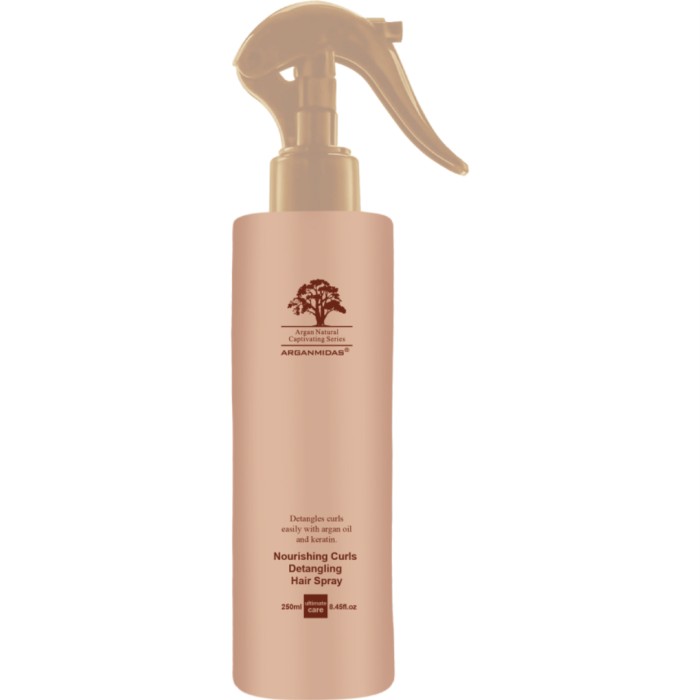 Arganmidas Nourishing Curls Detangling Hair Spray är en hårspray för lockigt hår som ger intensiv behandling och reder ut håret. Med arganolja, keratin, aloe vera och sheasmör ger sprayen näring åt lockigt hår och minskar frissighet. Sprayen gör håret glansigt och lätt att hantera. Formulan förseglar varje hårstrå med fukt och ger en fin lyster samtidigt som den förbättrar lockarnas definition.