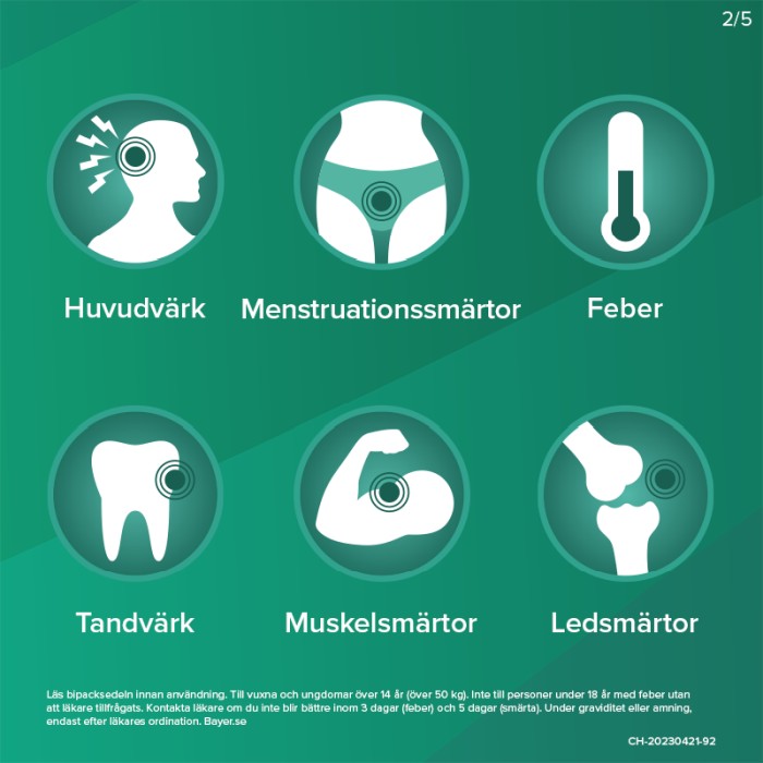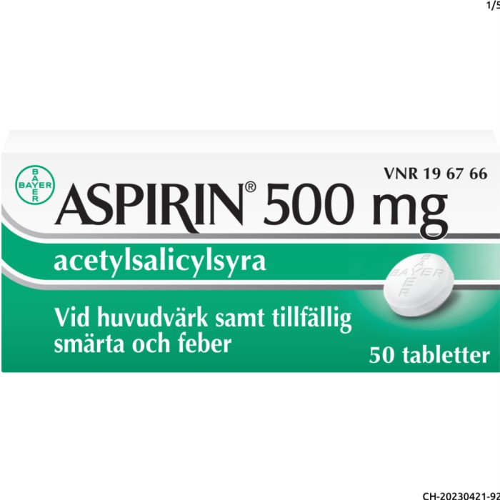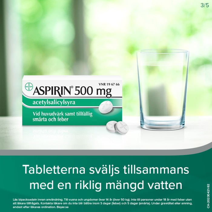 Vuxna: Rekommenderad dos, om läkare ej föreskrivit annat, är: Vuxna och ungdomar över 14 år (över 50 kg): 1-2 tabletter upp till 3 gånger per dygn med 4-8 timmars mellanrum. En högre daglig dos än 3 g (6 tabletter) får inte tas. Fler än 2 tabletter åt gången ger inte bättre smärtlindring. Högre doser kan medföra allvarliga risker. Kontakta läkare om symtomen försämras eller inte förbättras inom 3 dagar vid feber och 5 dagar vid smärta. Barn och ungdomar: Kroppsvikten bör användas vid beräkning av dosen (åldersangivelsen är ungefärlig). 30-50 kg (ca 10-14 år): 1 tablett (500 mg) 1-3 gånger per dygn med minst 4 timmars mellanrum, högst 3 tabletter per dygn. Använd inte Aspirin till barn i mer än 2 dygn i följd om inte läkare föreskriver annat. Varning: ska inte ges till personer under 18 år med feber utan att läkare tillfrågats beroende på risken för uppkomst av Reyes syndom, ett sällsynt men allvarligt sjukdomstillstånd. Aspirin ska inte ges till barn under 10 år. Tabletterna sväljs tillsammans med vätska och tas med fördel efter måltid.