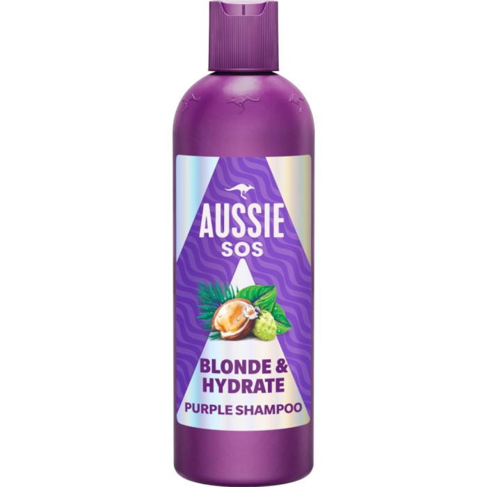 Aussie SOS Blonde & Hydrate Purple Schampo är ett lila schampo som neutraliserar mässingsfärgade och gula toner i blont, grått och slingat hår. Det gör samtidigt håret återfuktat och superglansigt. Använd gärna tillsammans med Aussie SOS Blonde & Hydrate Balsam för bästa resultat.