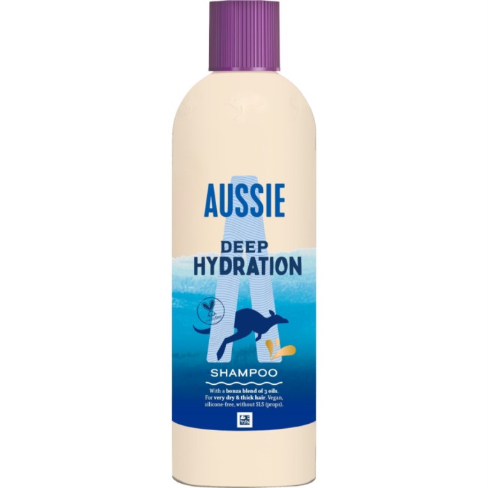 Aussie Deeep Moisture / Deep Hydration Schampo är ett hårschampo som ger fukt till hår som är mycket torrt och tjockt. Schampot är berikat med avokado, jojoba och australisk macadamianötolja. Med sin trippelblandning av oljor rengör och vårdar Deeep Moisture Schampo håret, samtidigt som det ger återfuktning. Veganskt (utan animaliska ingredienser). Silikonfritt.