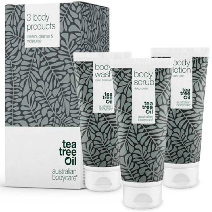 Body Wash duschtvål med tea tree-olja kan användas dagligen för rengöring av kroppen. Body Scrub används på fuktig hud och masseras noga in, och kan användas 1-2 gånger per vecka. (Ska inte användas i ansiktet.) Body Lotion är en daglig återfuktare för kroppen.