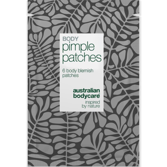 Hydrocolloid Body Pimple Patches från Australian Bodycare är plåster som används på blemmor på kroppen, t ex på rygg, bröst och axlar. Body Pimple Patches är stora, specialdesignade plåster som absorberar överflödigt talg och skyddar huden från smuts och bakterier. Dessa plåster är speciellt framtagna för större hudområden som rygg och bröst. De är gjorda i ett mjukt och smidigt material och sitter bra på kroppen – även när du rör dig eller sover. Innehåller salicylsyra som hjälper till att exfoliera huden och hålla porerna rena. Grönt teextrakt lugnar huden och minskar rodnad. Hyaluronsyra tillför fukt så att huden inte torkar ut.