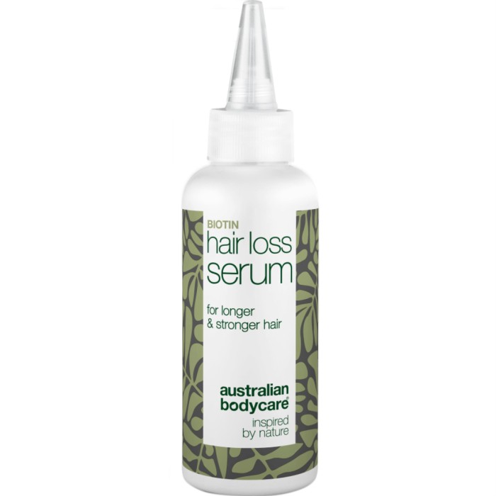 Australian Bodycare Hair Loss Serum är ett leave-in serum med tea tree-olja för alla som upplever håravfall, tunnare eller avtagande hårlinje eller som har mycket tunt, fint hår. Hair Loss Serum är framtaget för att underlätta för håret att växa sig tjockare och starkare. Serumet innehåller bl a Capilia Longa, Tea Tree Oil, biotin och niacinamid.
