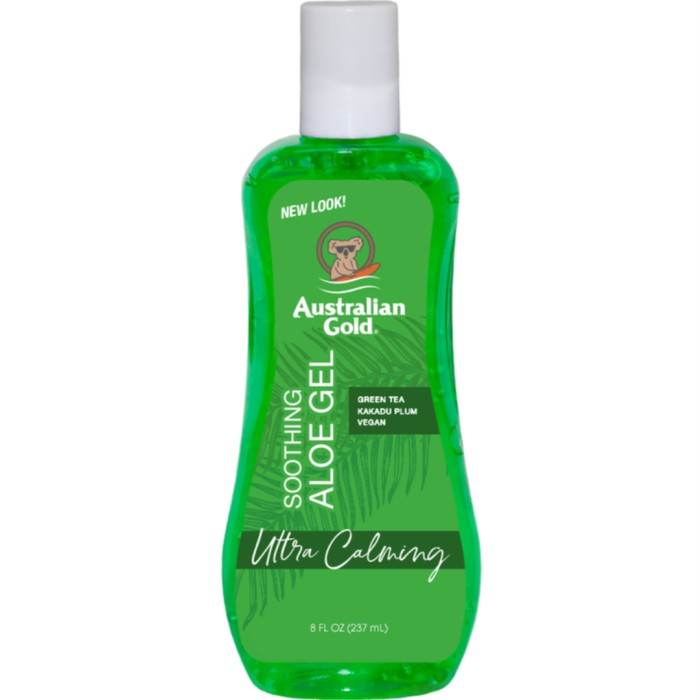 Australian Gold Soothing Aloe Gel är en gel som kan användas för att vårda huden efter en dag i solen. Gelen svalkar, fräschar upp och lugnar huden och innehåller ingredienser som aloe vera, grönt teextrakt, acaciaextrakt, vitamin C, vitamin E och antioxidanter.