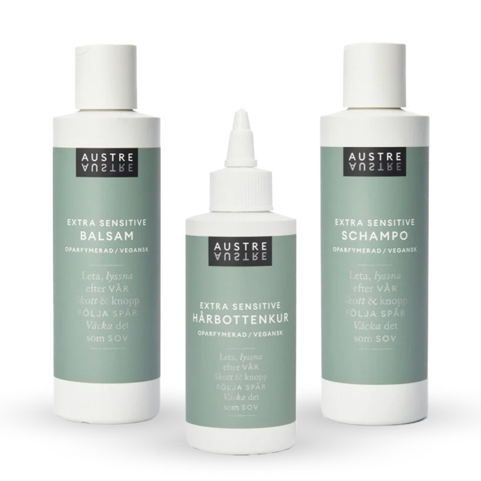 AUSTRE Extra sensitive hårkit innehåller en schampo, balsam och hårbottenkur för extra känslig hårbotten. Fritt från silikoner och sulfater. Oparfymerad och vegansk.