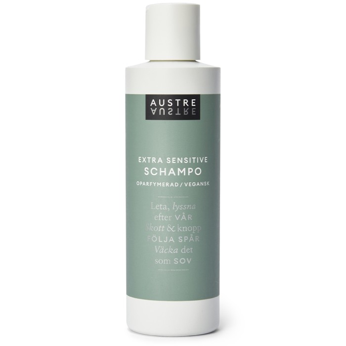 AUSTRE Extra Sensitive Schampo är ett lugnande och vårdande hårschampo utan parfym. Schampot återfuktar håret och hjälper till att återställa fuktbalansen i torr och känslig hårbotten. Austre Extra Sensitive schampo innehåller bland annat glycerin, en fuktgivare som hjälper till att binda fukten i huden och stärka hudbarriären.