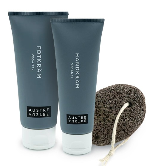 AUSTRE gåvokit innehåller en fotkräm, handkräm och pimpsten, du får dessutom en AUSTRE presentpåse på köpet!