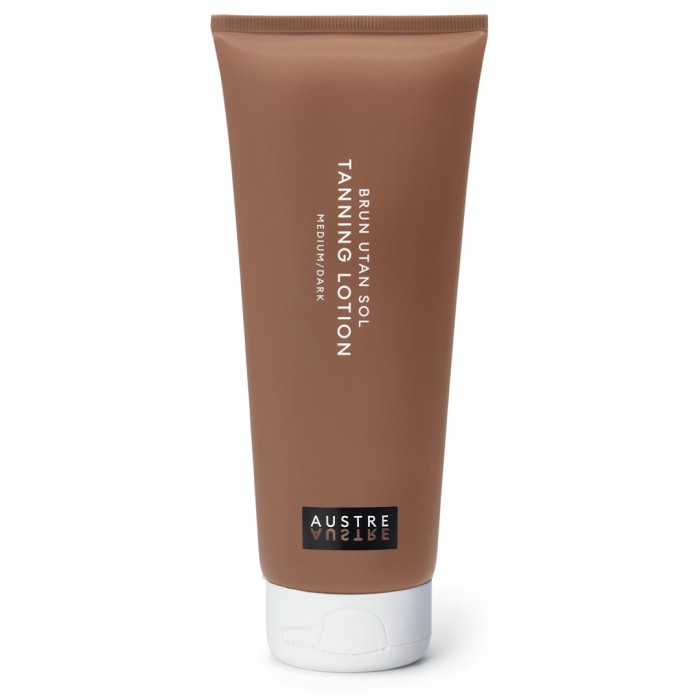 AUSTRE Tanning Lotion Medium/Dark är en brun utan sol-lotion för kroppen. Lotionen ger huden ett solkysst utseende efter 3-7 timmar. Kanske perfekt för dig som gärna undviker solen, men vill ge huden färg. Brun utan sol-lotionen från Austre är milt parfymerad och är tillverkad i Sverige.