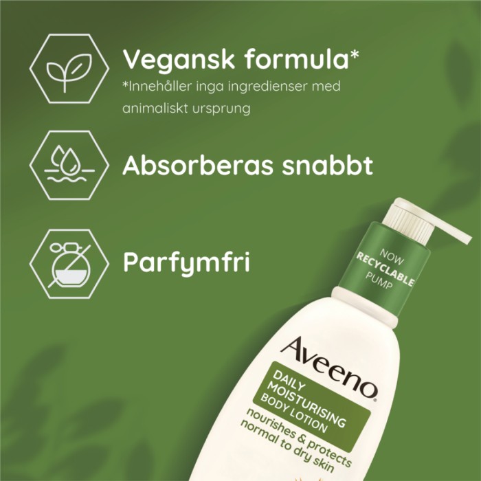 Aveeno Daily Moisturising Body Lotion är en oparfymerad kroppslotion kliniskt bevisad att återfukta huden omedelbart och i upp till 48 timmar*. Aveeno Daily bodylotion innehåller kollodialt havre med prebiotiska egenskaper (in vitro) och mjukgörande ingredienser. Hjälper till att stärka hudens naturliga barriär för att skydda huden mot yttre faktorer och minskade fuktnivåer. Lotionen absorberas snabbt in i huden och kladdar inte. Framtagen för att ge näring till huden och motverka torr hud.