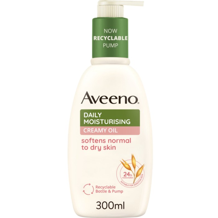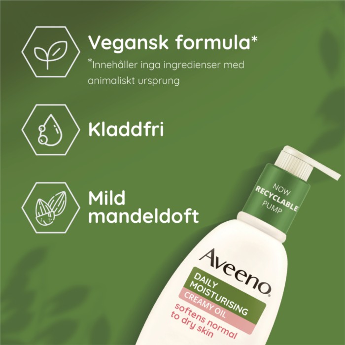 Aveeno Daily Moisturising Creamy Oil är en återfuktande oljekräm för ansiktet och kroppen. Aveeno Creamy Oil är en milt mandeldoftande oljekräm med sötmandelolja och kollodialt havre med prebiotiska egenskaper (in vitro). Formuleringen återfuktar huden i upp till 24 timmar för att skydda och tillföra näring till torr hud utan att lämna huden kladdig.