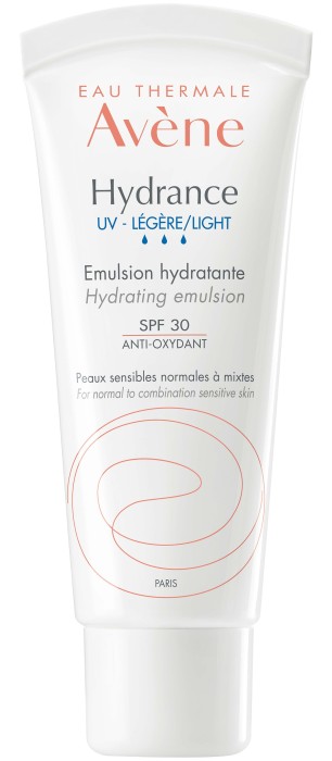 Hydrance UV-Light Hydrating Emulsion SPF30 från Avène är en återfuktande ansiktskräm med UV-skydd som passar för känslig, kombinerad hud.