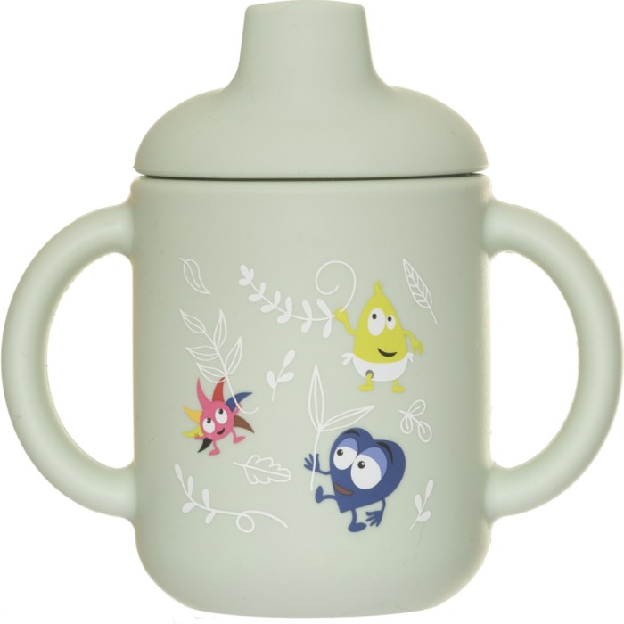 Babblarna silikonmugg med lock och två handtag och ett motiv med Babblarna i naturen. Muggen är tillverkad av livsmedelsgodkänt silikon. Storlek 10,5 x 11 cm.
