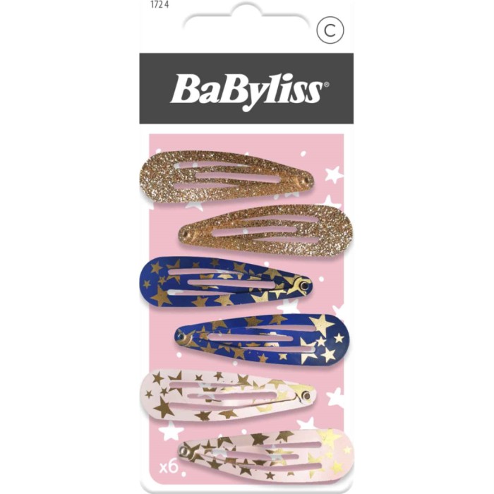 BaByliss festliga hårclips för barn innehåller en härlig mix av 2 st guldfärgade, 2 st vita med guldstjärnor, 2 st blå med guldstjärnor. Kan användas för att hålla undan hårslingor som lossnar från en håruppsättning eller för att dekorera en frisyr.