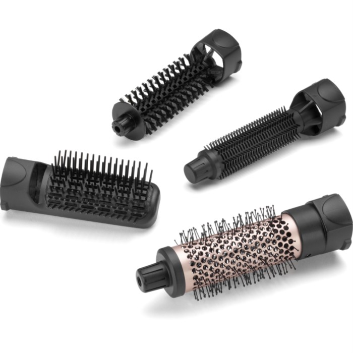 BaByliss Smooth Finish 1200 W varmluftsborste torkar och stylar på en och samma gång. Har 4 utbytbara huvuden som torkar, ger volym, slätar ut och plattar håret. Du kan skapa volym när du torkar med en 38 mm värmeborste eller använda 25 mm eller 20 mm mjuka borstar för att forma håret. Använd plattborsten för ett slätt och glänsande resultat. Varmluftsborsten har en låg vikt vilket ger enkel hantering och ett salongsliknande föningsresultat hemma.