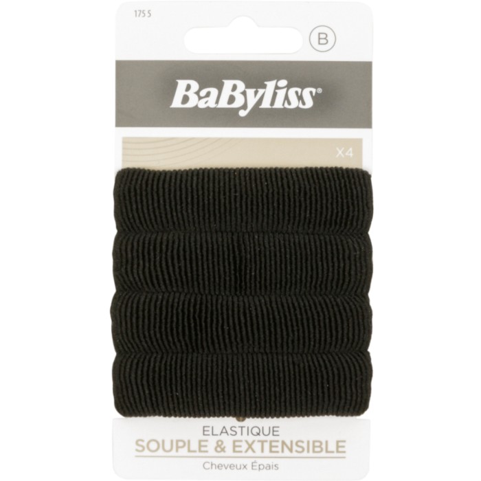 BaByliss tjocka och mjuka hårsnoddar i 4-pack. Svarta snoddar som passar för lite tjockare hår. Utan metalldelar.