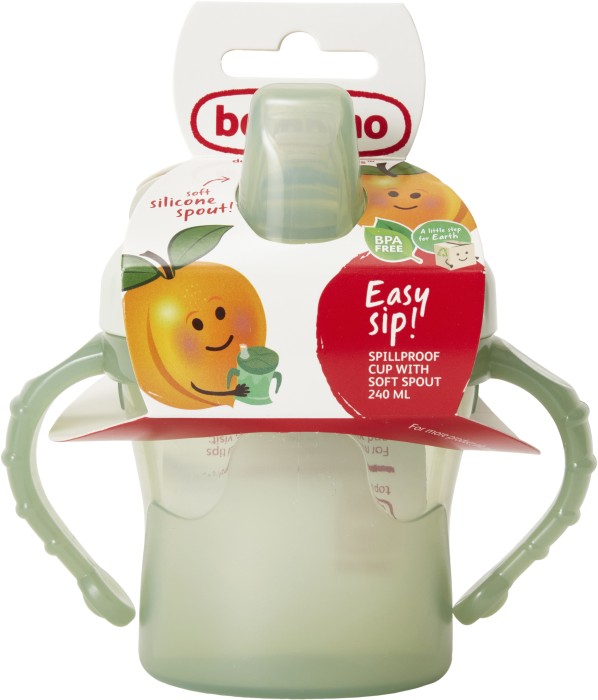 Easy sip! är en måltidsmugg från Bambino, här i färgen mint. Muggen är utvecklad för barn som ska börja prova riktig mat, alltså från 6 månaders ålder. Easy sips mjuka drickpip i silikon känns bekant för barn som tidigare är vana att dricka ur flaska, vilket kan hjälpa vid övergången från flaska till mugg. Muggen är praktiskt spillfri, har rejäla handtag och den är dessutom enkel att plocka isär och rengöra. Den har även ett hygieniskt lock som skyddar pipen, vilket gör att flaskan är passar bra att stoppa ner i väskan och ta med sig på språng.