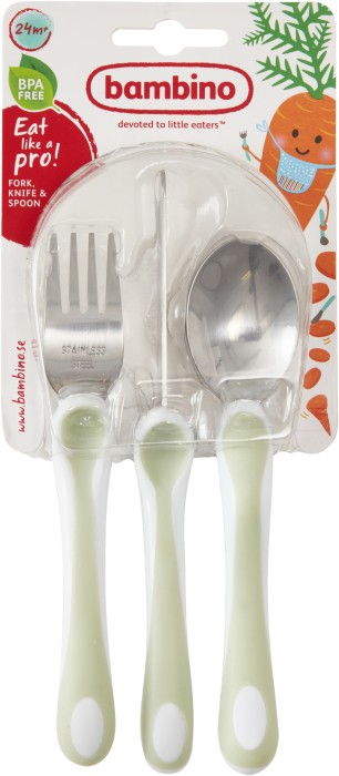 Eat like a pro! är barnbestick från Bambino. Besticksetet innehåller gaffel, kniv och sked och är till för barn som har lärt sig äta själva och nu är redo att äta med likadana bestick som mamma eller pappa.