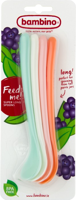 Bambino Feed me! Super Long Spoons är matningsskedar med långt skaft. Gör det enklare att nå hela vägen ned i barnmatsburkarna.
