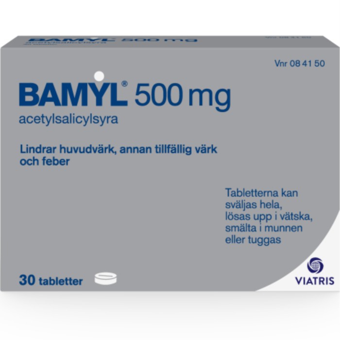 För smärtlindring och febernedsättning Vuxna och ungdomar över 14 år: 1 - 2 tabletter 1 - 3 gånger per dygn eller enligt läkares föreskrift, högst 6 tabletter per dygn. Mer än två tabletter åt gången ger ej bättre smärtstillande effekt. Kontakta läkaren om symptomen försämras eller inte förbättras inom 3 dagar vid feber och inom 5 dagar vid smärta. Barn och ungdomar 7-14 år: ½ tablett 1-3 gånger per dygn högst 2-3 dagar i följd eller enligt läkares föreskrift, högst 1 ½ tablett per dygn. Bamyl ska inte ges till barn under 7 år. Varning: Ska inte ges till personer under 18 år med feber utan att läkare tillfrågats beroende på risken för uppkomst av Reyes syndrom, ett sällsynt men allvarligt sjukdomstillstånd.