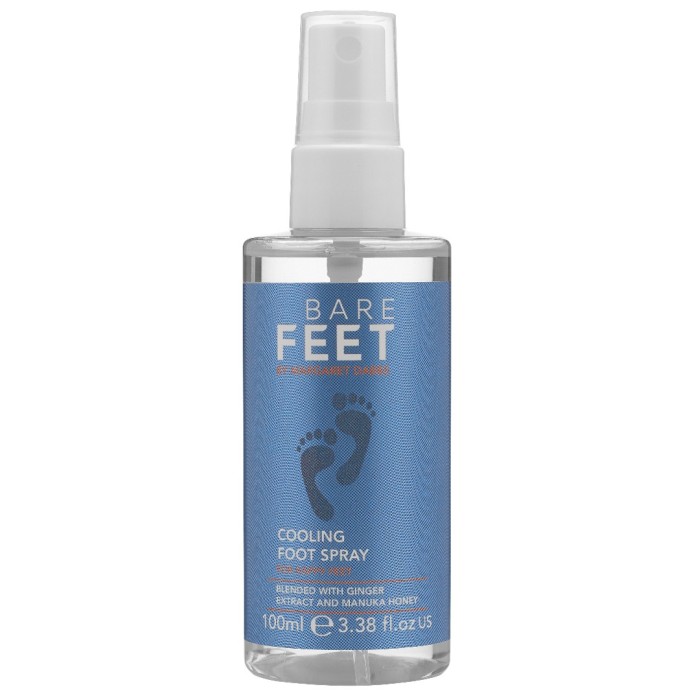 Bare Feet Foot Spray har en upplyftande doft grönt te & lime och gör att fötterna direkt känns svalkade och återupplivade. Fotsprayen innehåller bland annat ingefärsextrakt och manukahonung.