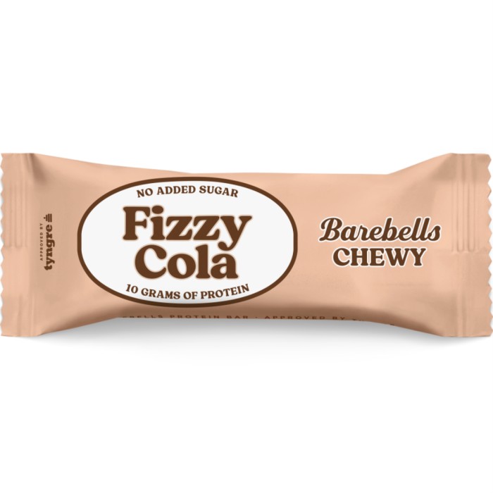 Barebells Chewy Fizzy Cola har en marshmallow-liknande konsistens och är täckt med ett lager av choklad. Innehåller 10 gram protein och är utan tillsatt socker. Innehåller sötningsmedel.