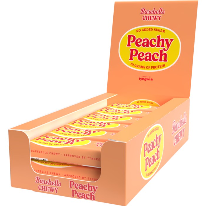 Barebells Chewy Peachy Peach har en marshmallow-liknande konsistens och är täckt med ett lager av choklad. Innehåller 10 gram protein och är utan tillsatt socker. Innehåller sötningsmedel.