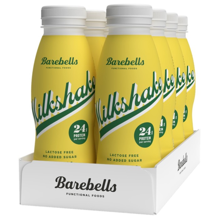 Barebells Milkshake Banana är en shake som innehåller 24 g protein per flaska. Barebells shake är laktosfri. Innehåller sötningsmedel.