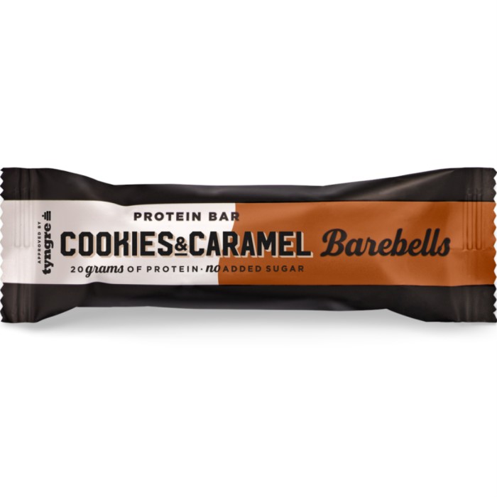 Barebells Protein Bar Cookies & Caramel är en proteinbar med smak av kakor, kola och choklad med ett överdrag av mjölkchoklad (22%) och sojapuffar (5%). Innehåller sötningsmedel och naturligt förekommande socker.
