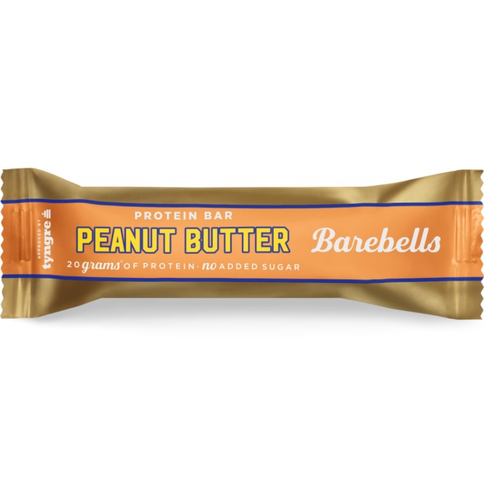 Barebells Protein Bar Peanut Butter är en proteinbar med jordnötssmör (7,9%), rostade jordnötsbitar (4,1%) och mjölkchokladöverdrag (23%). Innehåller sötningsmedel och naturligt förekommande socker. Utan palmolja. En bar innehåller 20 gram protein.