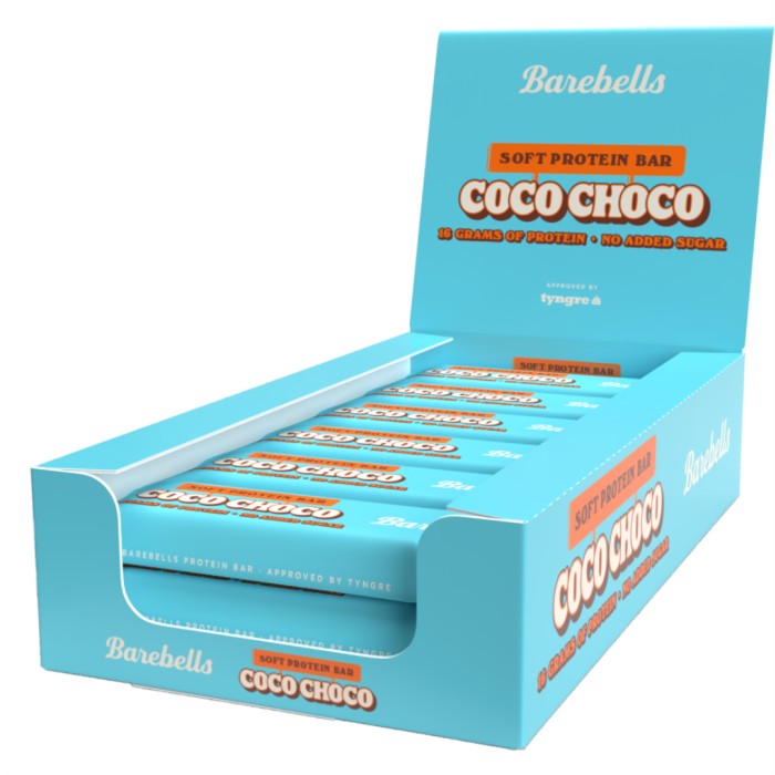 Barebells Soft Proteinbar Coco Choco är en mjuk proteinbar med chokladöverdrag och en smak av kokos. Innehåller sötningsmedel. Utan palmolja. En bar innehåller 16 gram protein.