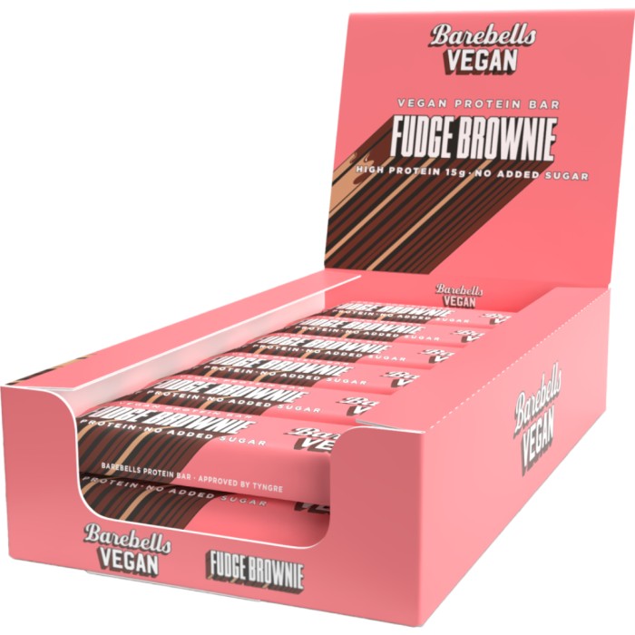 Barebells Vegan Bar Fudge Brownie är en vegansk proteinbar med kakaoöverdrag (24%), chokladbitar (5,5%) och fudge-browniesmak. En bar innehåller 15 gram protein. Innehåller sötningsmedel.