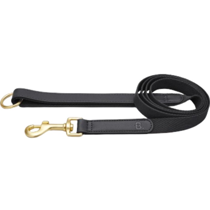 Ett elegant svart hundkoppel från Barkalot, tillverkat i webbing av återvunna plastflaskor och med detaljer gjorda i veganskt läder. Det veganska lädermaterialet är tillverkat av rester från majsskörd. Kopplet har även metalldetaljer i en matt guldfärgad lättviktsmetall som ger en lite lyxigigare känsla.