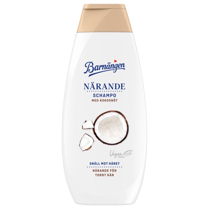 Barnängen Närande är ett schampo med kokosnötsextrakt för torrt hår. Schampot har en vegansk formulering och verkar intensivt vårdande för att ta hand om håret från rot till topp. Schampot gör att håret känns smidigt och fräscht, och ger håret glans.