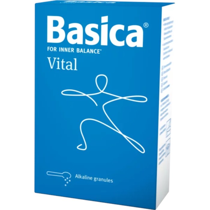 Basica Vital är ett kosttillskott med en kombination av naturliga mineralämnen och spårelement. Innehåller bland annat zink, magnesium, kalcium och krom. Zink bidrar till en normal syra-basbalans samt en normal kolhydrat- och fettsyraomsättning. Magnesium bidrar till att minska trötthet och utmattning samt stöder en normal psykologisk funktion. Magnesium och kalcium bidrar till en normal energiomsättning. Krom bidrar till en normal omsättning av makronäringsämnen.
