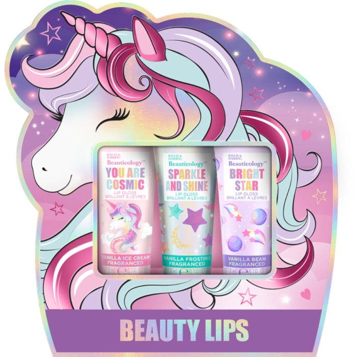 Baylis & Harding Beauticology Unicorn Lip Trio Gift Set är ett presentset med tre söta lipgloss (3 x 8 ml). Lipglossen mjukar upp läpparna och ger fin glans.