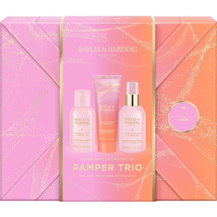 Baylis & Harding Jojoba, Vanilla & Almond Oil Wrapped Body Trio Gift Set är ett presentset med badskum (100 ml), kroppsspray (100 ml) och fuktighetskräm (50 ml). Presentsetet är fint förpackat i en vackert dekorerad kartong - redo att ges bort.