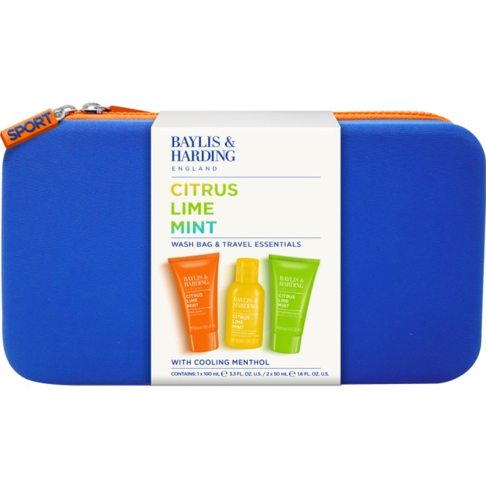 Baylis & Harding Men`s Citrus, Lime & Mint Wash Bag Set är en färgglad necessär med hår- och kroppstvål (100 ml), ansiktstvätt (50 ml) och aftershave balm (50 ml) i resevänliga storlekar. Necessären är i blått tyg och rymmer toalettartiklar för träning och semester.