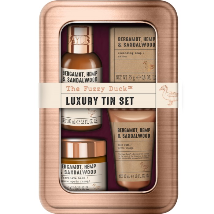 Baylis & Harding Men's The Fuzzy Duck Tin Gift Set är ett presentset med hår- och kroppstvål (100 ml), aftershave-balsam (50 ml), ansiktstvätt (30 ml) och tvål (25 g) i resevänliga storlekar. Allt du behöver för lyxig ansikts- och skäggvård i en återanvändbar burk.